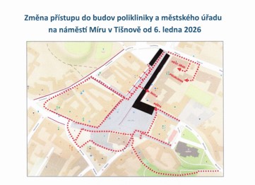 Změna přístupu do budov polikliniky a městského úřadu na náměstí Míru v Tišnově od 6.1.2026 Informace o rekonstrukci náměstí najdete na stránkách www.tisnov.cz.