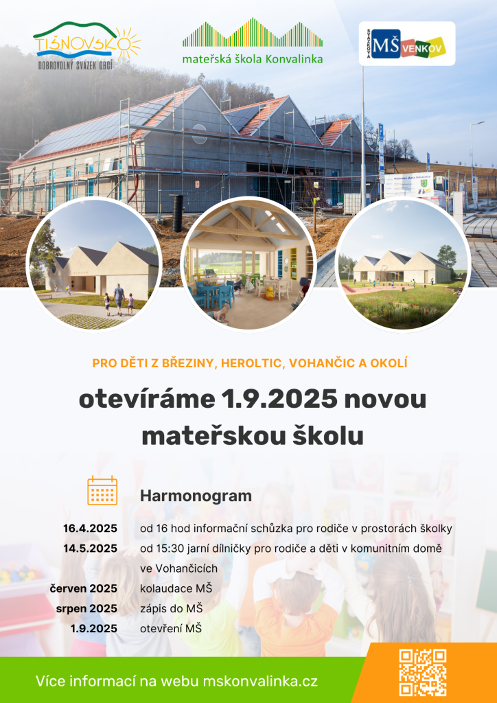 Mateřská škola Konvalinka bude primárně sloužit pro děti z obcí Vohančice, Březina a Heroltice. Pokud budou volná místa, budeme moci přijmout i děti z okolních obcí. Obec Vohančice má rezervováno 9 míst, okolní obce po 8 místech. Pokud některá obec svou rezervaci v daném roce nevyužije, mohou ji využít jiné obce.
