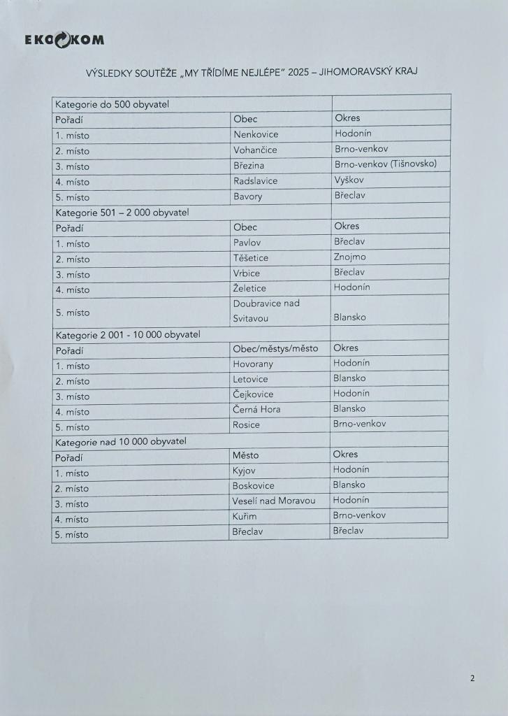 18.9. proběhlo na zámku v Rosicích slavnostní vyhlášení výsledků soutěže pro města a obce Jihomoravského kraje My třídíme nejlépe, kterou vyhlašují Autorizovaná společnost EKO-KOM, a.s. a Jihomoravský kraj.